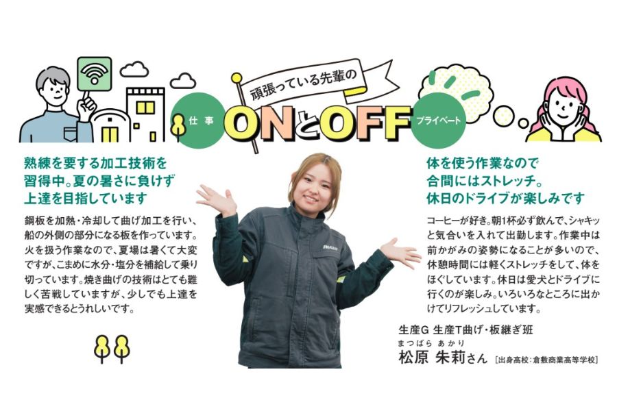 造船特有の伝統技術といわれる工程に従事し、入社間もないですが、持ち前の明るさと前向きな姿勢で成長してくれています。その姿に先輩たちも刺激をもらっています。今後も技術を磨きつつ、後輩ができたら先輩として指導することを期待しています。