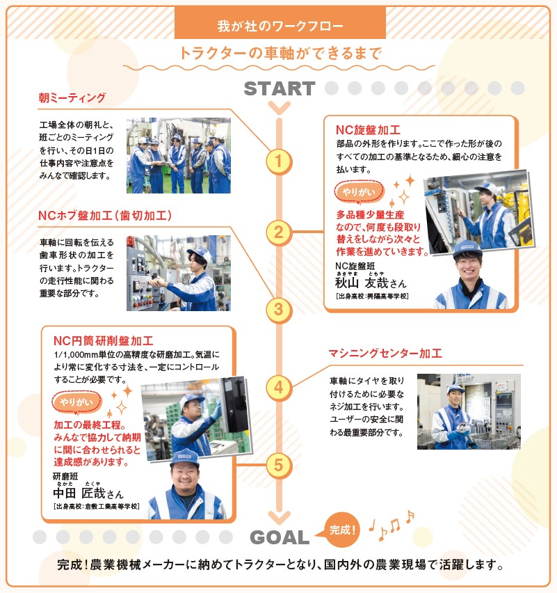 主に農業機械に用いられる金属部品を製造。高い技術力が大手メーカーに信頼され、製品の性能に直結する重要部品の製造を任されています。景気の影響を受けにくい業界で、安定した経営基盤を確立。「ものづくりは人づくり」との思いで社員教育に力を入れており、その成果が現れて社内は活気に満ちた雰囲気です。