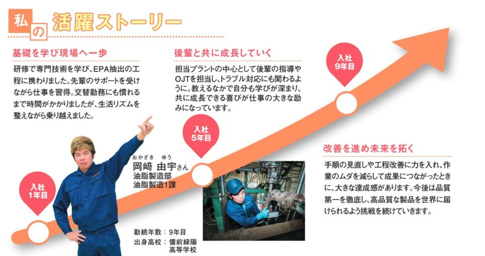 - 健康食品や医薬品は社会に欠かせない分野です。その製造を担う備前化成なら、安定した職場環境のもとで長く働けると感じ、志望しました。