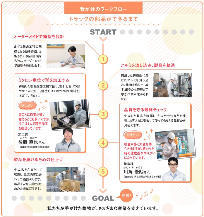 全国に10社しかない3工法(ダイカスト鋳造・砂型鋳造・金型重力鋳造)に対応できるアルミニウム合金鋳造メーカーです。そのため取引先は多岐にわたり、農業から医療まで多様な分野の製品を手がけています。最近は若手社員の活躍も増え、約35%が10~20代。働きやすい環境や制度にも力を入れています。
