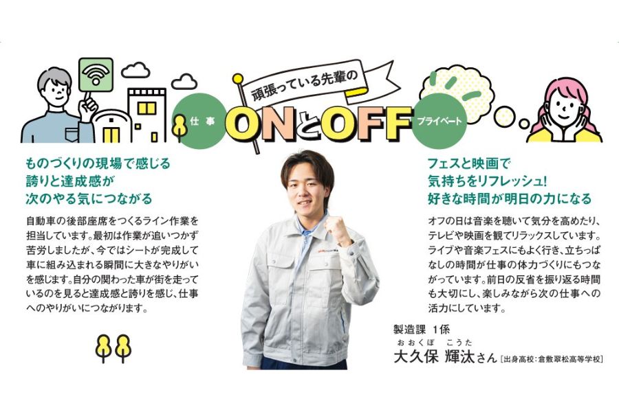 三菱自動車の水島製作所向けに自動車のシートを製造している会社です。東証プライム上場企業のグループ会社として福利厚生や教育制度が充実し、サービス残業ゼロや働きやすい環境づくりに力を入れています。新入社員歓迎イベントや日帰り旅行などの行事もあり、穏やかで気さくな人が多い明るい雰囲気の職場です。