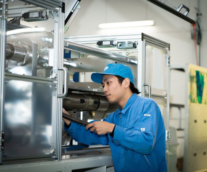 設計から組立、据付まで一貫対応で、お客さまのニーズに応える機械メーカー。大手自動車メーカー向けを中心に、エンジンの組立装置や計測装置といった省力機器の設計製作を手掛けています。また、その技術を活かした当社オリジナル製品の耐久試験機は、「折りたたみスマホ」に代表される分野においては、世界市場で高いシェアを誇ります。