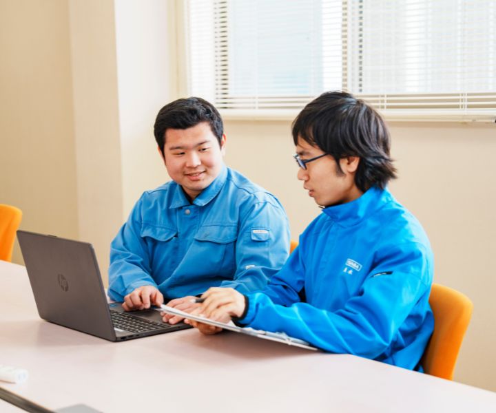 各種生産設備やエンジン試験装置などの電装制御設計を担当してくれている仲井さん。難易度の高い制御調整も、コツコツと地道に頑張ってくれていますね。これからも経験を重ね、技術者としてさらに成長していくことを期待しています。
